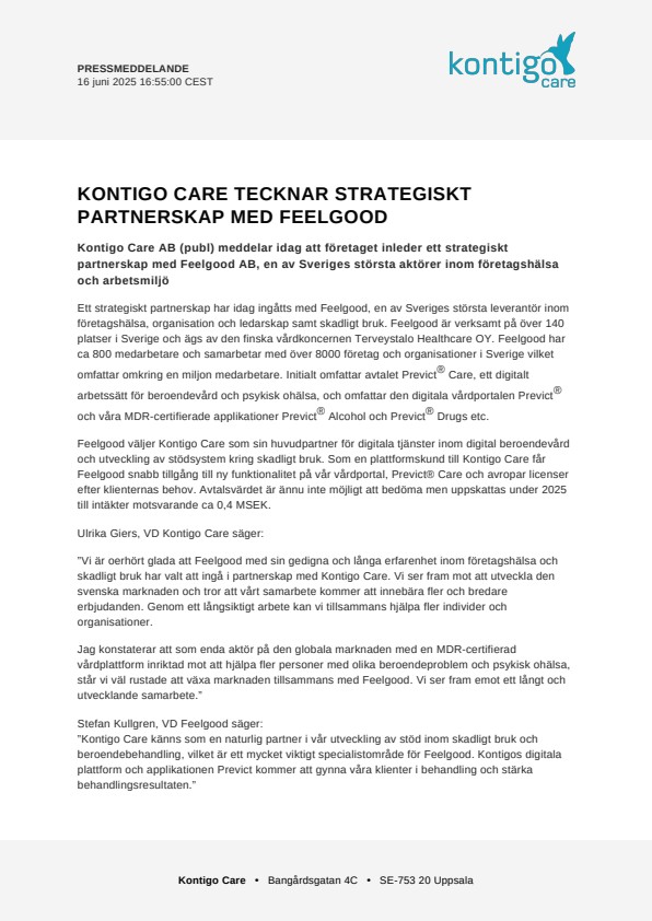 Feelgood väljer Kontigo Care som sin huvudpartner för digitala tjänster inom digital beroendevård och utveckling av stödsystem kring skadligt bruk. Som en plattformskund till Kontigo Care får Feelgood snabb tillgång till ny funktionalitet på vår vårdportal, Previct® Care och avropar licenser efter klienternas behov. Avtalsvärdet är ännu inte möjligt att bedöma men uppskattas under 2025 till intäkter motsvarande ca 0,4 MSEK.